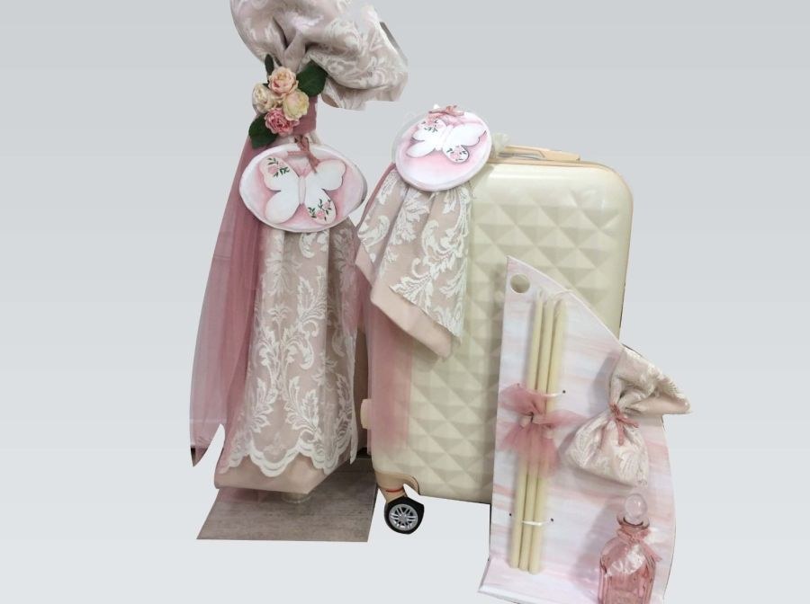 Σετ βάπτισης που περιλαμβάνει βαλίτσα στολισμένη με θέμα την πεταλούδα, λαμπάδα και λαδοσετ.