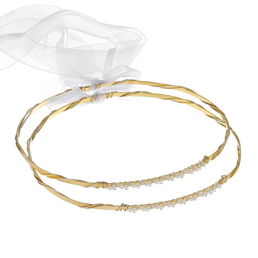 - Styling Tip: Η λευκή σατέν κορδέλα που ενώνει τα στέφανα προσφέρει την απαραίτητη «ιερή» αντίθεση στη λάμψη του χρυσού, καθιστώντας τα ιδανικά για φωτογραφήσεις.