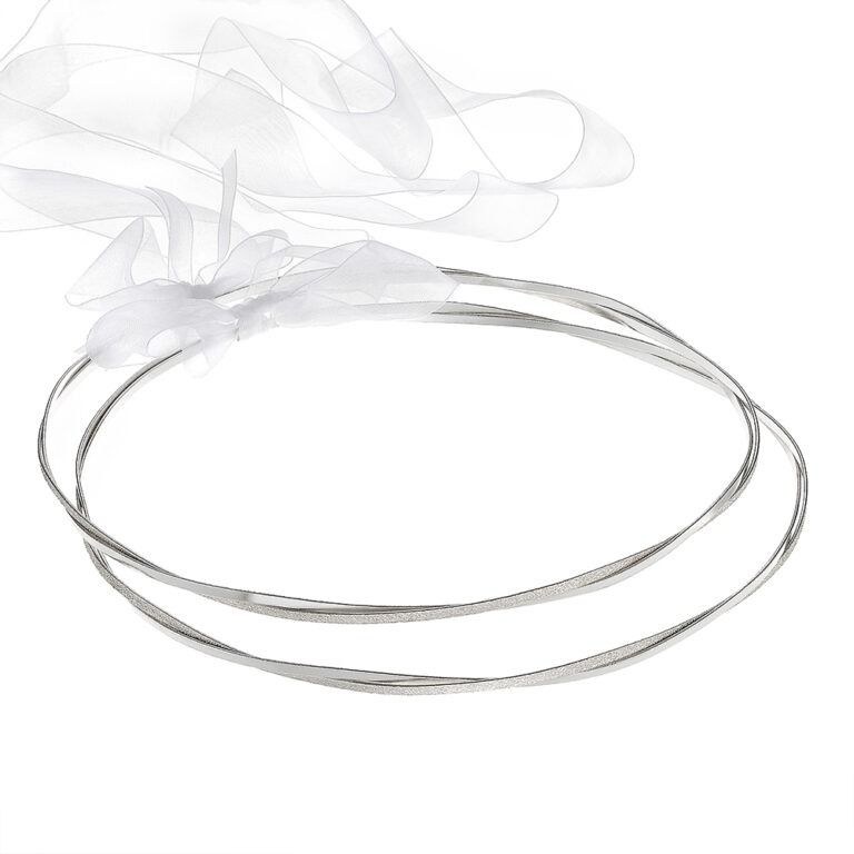 Απλά και κομψά στέφανα γάμου σε ασημένιο χρώμα με minimal σχεδιασμό και λευκή αέρινη κορδέλα. Ιδανική επιλογή για διακριτική πολυτέλεια και μοντέρνα αισθητική, ταιριάζει τέλεια σε μοντέρνους και παραδοσιακούς γάμους. Χειροποίητα στέφανα με έμφαση στην ποιότητα και το στυλ.