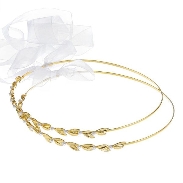 Εντυπωσιακά στέφανα γάμου σε χρυσό χρώμα με λεπτεπίλεπτα φύλλα και μικρές πέρλες, διακοσμημένα με λευκή αέρινη κορδέλα. Ιδανική επιλογή για λαμπερό και αρχοντικό γάμο με αισθητική υψηλών προδιαγραφών. Χειροποίητα στέφανα για ζευγάρια που θέλουν να ξεχωρίσουν με μοναδικό στυλ και πολυτέλεια.