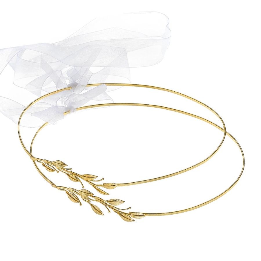 Κλασικά στέφανα γάμου σε χρυσή απόχρωση, διακοσμημένα με κομψά μεταλλικά φύλλα και λευκή κορδέλα. Ιδανικά για elegant τελετές με έμφαση στην παράδοση και τη φυσική ομορφιά. Χειροποίητη δημιουργία που αναδεικνύει τη διαχρονικότητα και το στυλ κάθε γάμου.