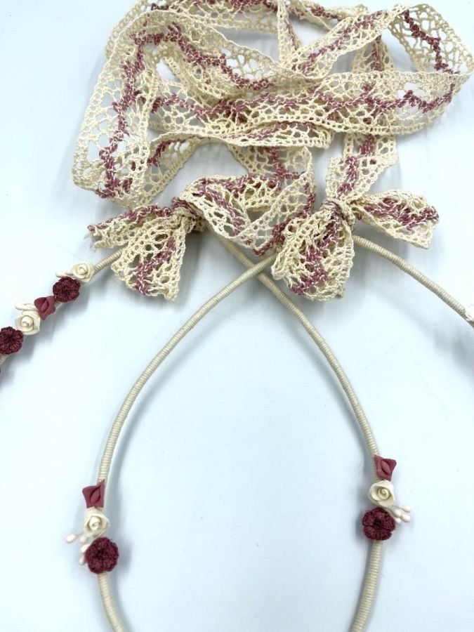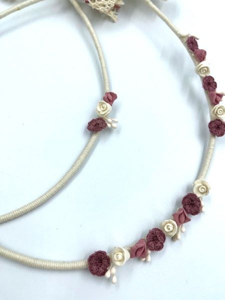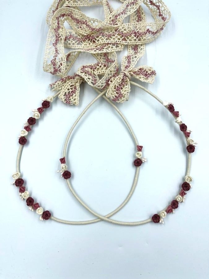 Στέφανα γάμου off white με ανθάκια στο ίδιο χρώμα και σάπιο μήλο, υφασμάτινα και κεραμικά. Δέσιμο με δίχρωμη δαντέλα.