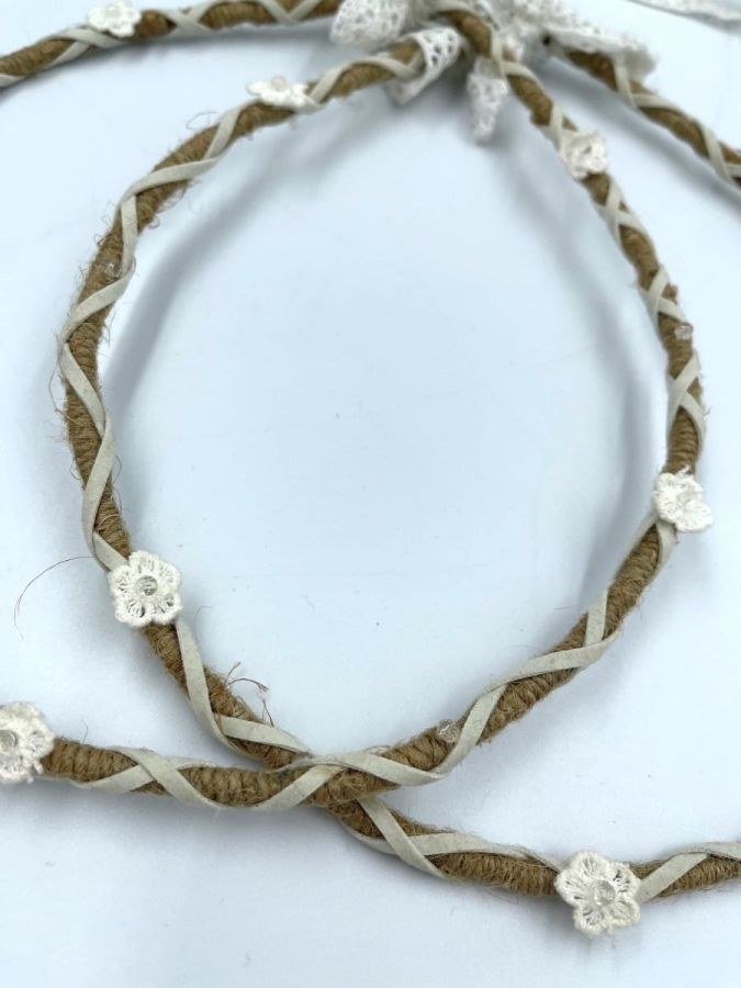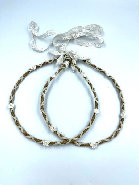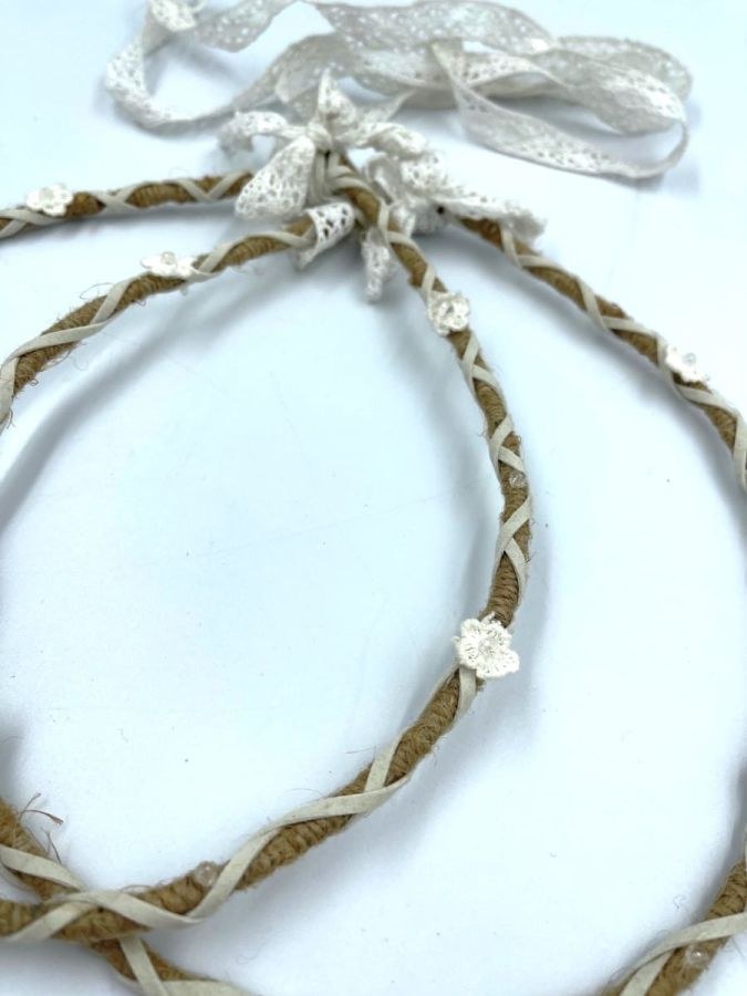 Στέφανα γάμου σπάγγος και σονέτ off white με ανθάκια και δέσιμο με λεπτή δαντέλα.