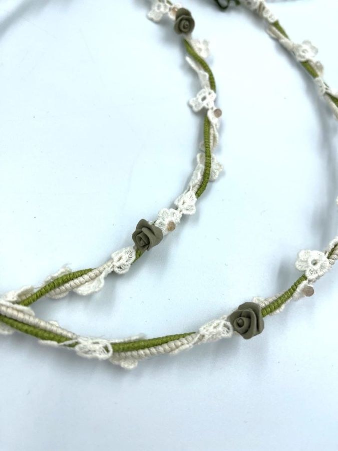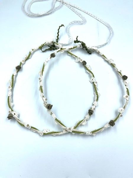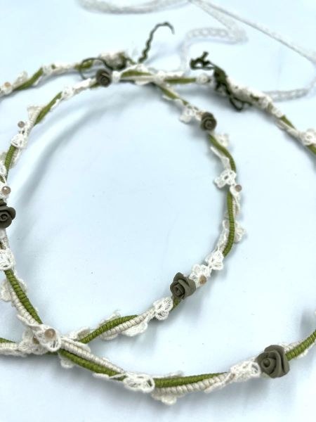 Στέφανα γάμου λαδί και off white. Ανθάκια με δαντέλα και κεραμικά και δέσιμο με λευκή δαντέλα.