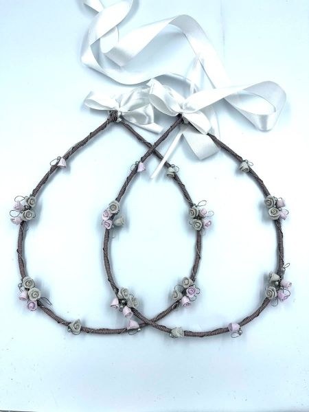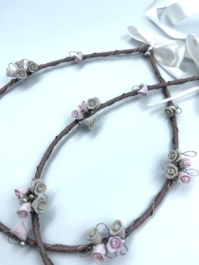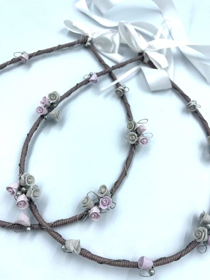 Στέφανα γάμου λιλά με ανθάκια κεραμικά λιλά και γκρι, και σατέν λευκή κορδέλα στο δέσιμο.