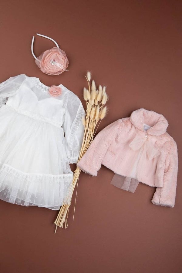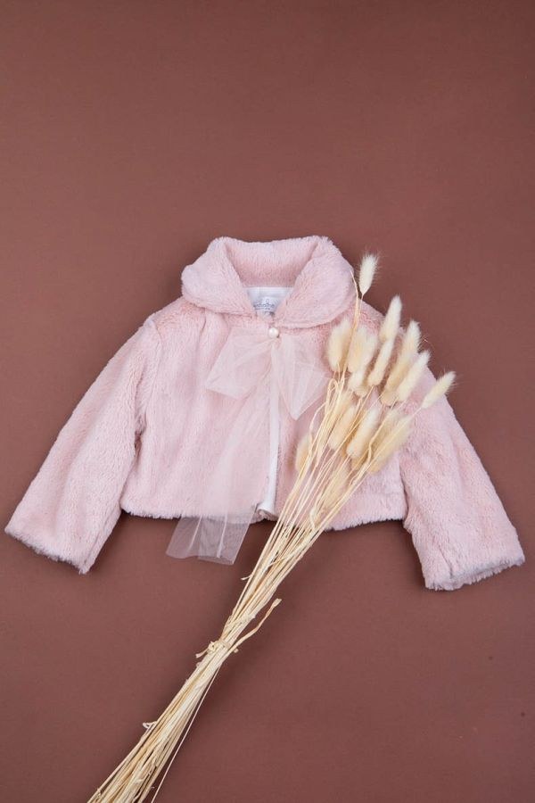 Πολύ απαλό και ζεστό πανωφόρι από πολυτελές faux-fur σε ροζ blush. Cropped γραμμή που «αγκαλιάζει» το φόρεμα χωρίς να το καλύπτει, με στρογγυλό γιακά και ρομαντικό δετό φιόγκο από τούλι μπροστά. Ιδανικό για φθινοπωρινές/χειμωνιάτικες βαπτίσεις και φωτογραφίσεις.