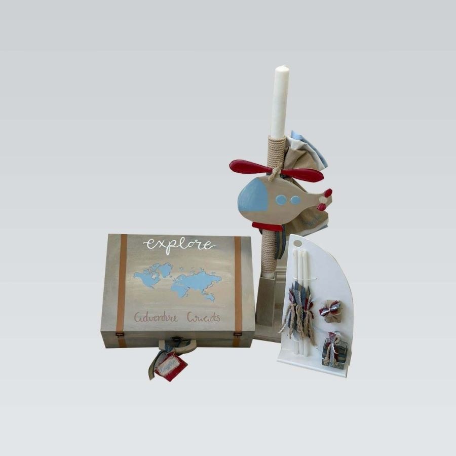 Σετ βάπτισης που περιλαμβάνει ξύλινη βαλίτσα με θέμα το ταξίδι, λαμπάδα και λαδοσετ.