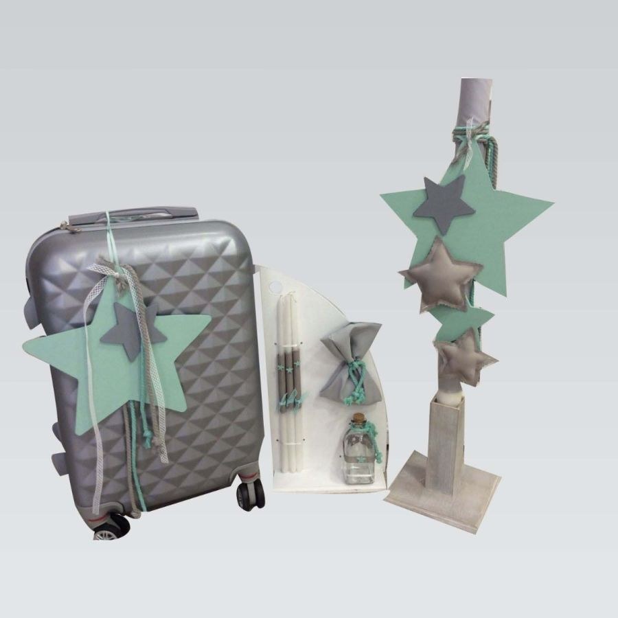 Χειροποίητο σετ βάπτισης που περιλαμβάνει βαλίτσα στολισμένη με θέμα τα αστέρια, λαμπάδα με ύφασμα και λαδοσέτ.