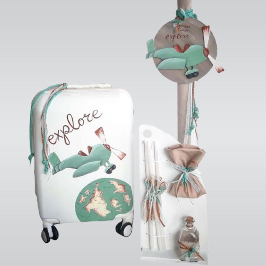 Χειροποίητο σετ βάπτισης που περιλαμβάνει βαλίτσα τρόλει ζωγραφισμένη στο χέρι, λαμπάδα με ξύλινο καδράκι και λαδοσέτ με θέμα το ταξίδι.