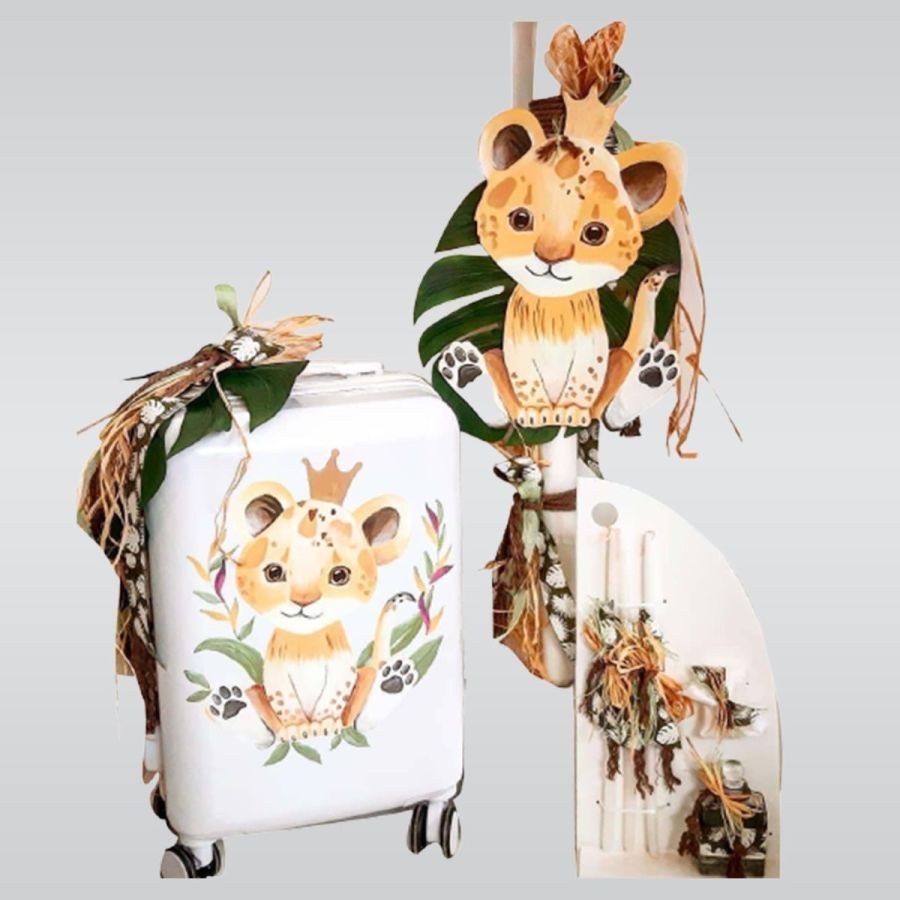 Χειροποίητο σετ βάπτισης που περιλαμβάνει βαλίτσα τρόλει ζωγραφισμένη στο χέρι, λαμπάδα με ξύλινο καδράκι και λαδοσέτ με θέμα το λιοντάρι.