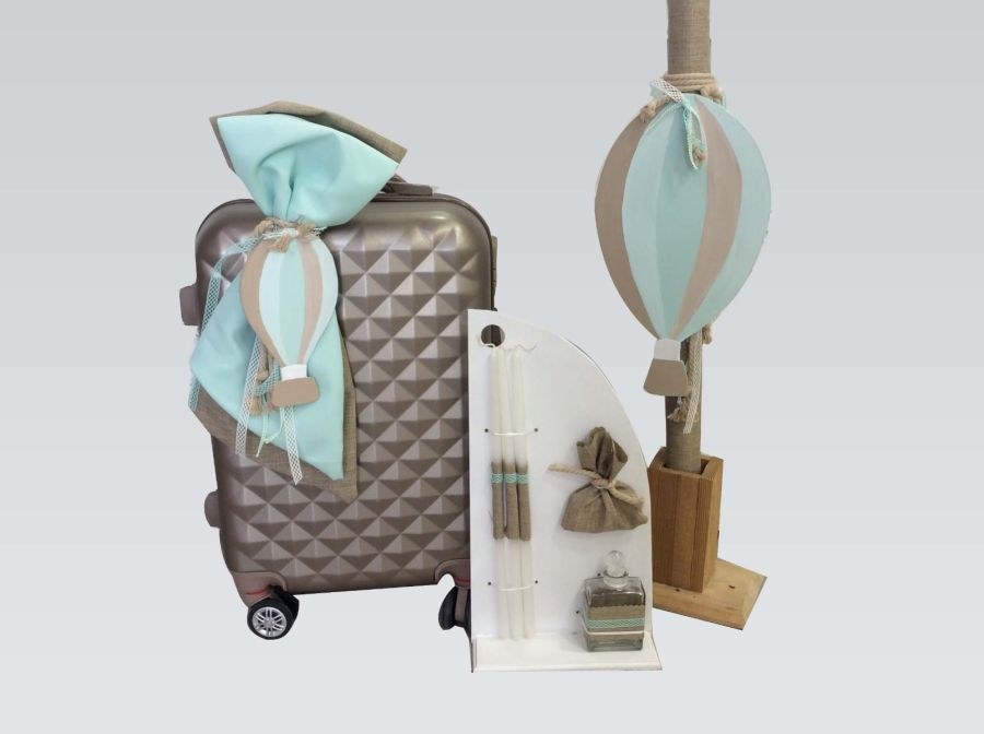 Χειροποίητο σετ βάπτισης που περιλαμβάνει βαλίτσα στολισμένη με θέμα αερόστατο, λαμπάδα με ύφασμα και λαδοσέτ.