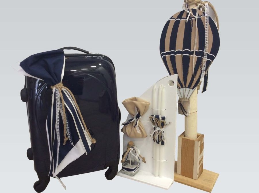 Χειροποίητο σετ βάπτισης που περιλαμβάνει βαλίτσα στολισμένη με θέμα το αερόστατο, λαμπάδα με ύφασμα και λαδοσέτ.