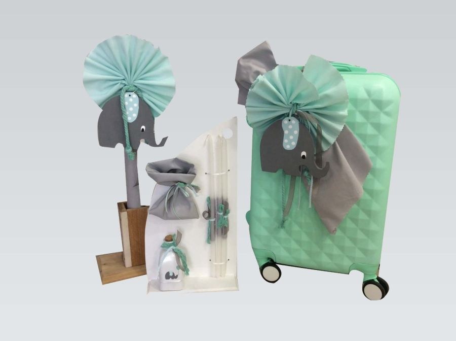 Χειροποίητο σετ βάπτισης που περιλαμβάνει βαλίτσα στολισμένη με θέμα τον ελέφαντα, λαμπάδα με ύφασμα και λαδοσέτ.