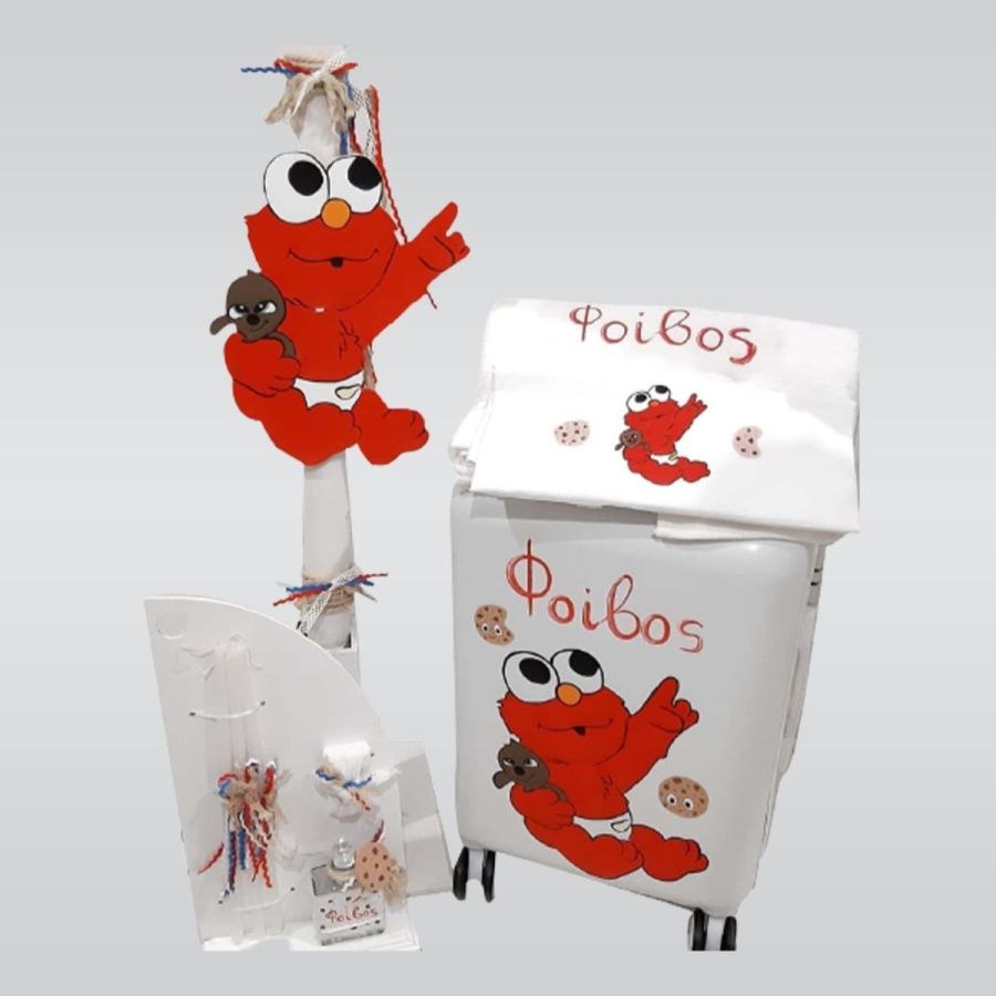 Χειροποίητο σετ βάπτισης που περιλαμβάνει βαλίτσα τρόλει ζωγραφισμένη στο χέρι, λαμπάδα με ξύλινο καδράκι και λαδοσέτ με θέμα muppet show (Elmo).