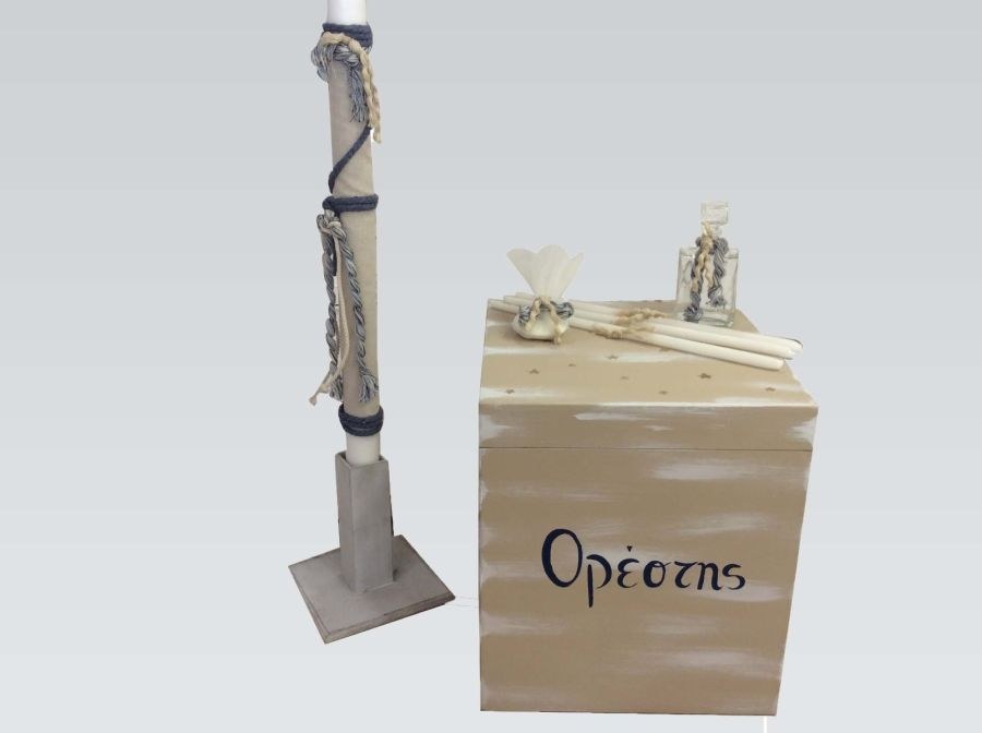 Χειροποίητο σετ βάπτισης που περιλαμβάνει κύβο ζωγραφισμένο, λαμπάδα με ύφασμα και λαδοσέτ.