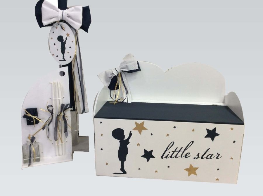 Χειροποίητο σετ βάπτισης που περιλαμβάνει θρανίο-παγκάκι ζωγραφισμένο, λαμπάδα με ύφασμα και λαδοσέτ.