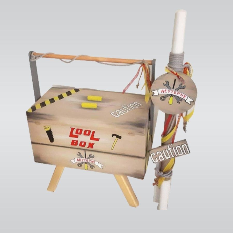 Σετ βάπτισης που περιλαμβάνει ξύλινη εργαλειοθήκη, λαμπάδα και λαδοσετ.