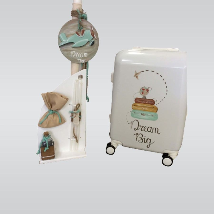 Σετ βάπτισης που περιλαμβάνει βαλίτσα, λαμπάδα και λαδοσετ.