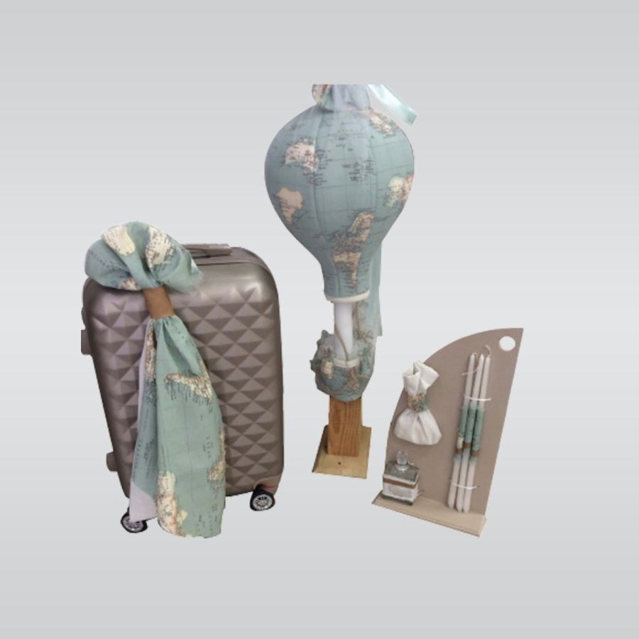 Σετ βάπτισης που περιλαμβάνει βαλίτσα, λαμπάδα και λαδοσετ.