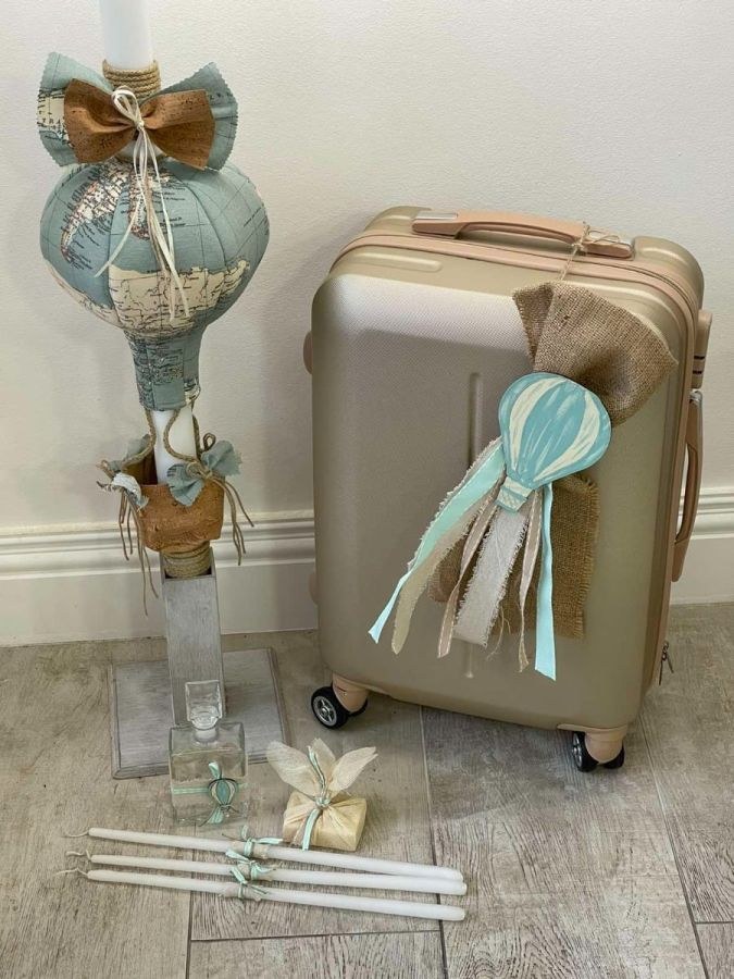 Σετ βάπτισης που περιλαμβάνει βαλίτσα στολισμένη με αερόστατο, λαμπάδα και λαδοσετ.