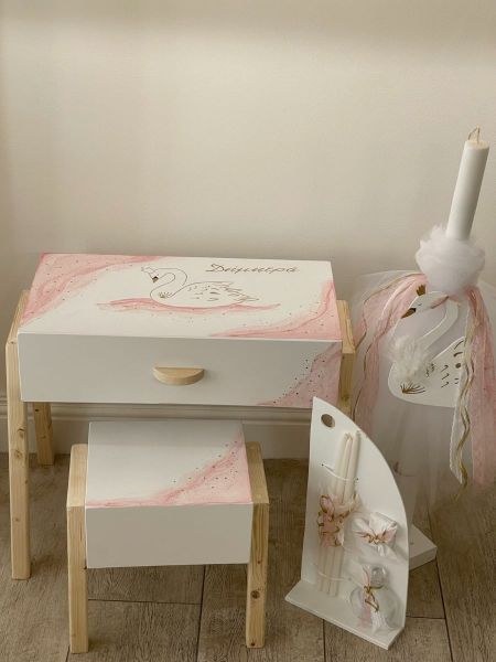 Σετ βάπτισης που περιλαμβάνει θρανίο-παγκάκι-σκαμπώ ζωγραφισμένο με θέμα τον κύκνο, λαμπάδα και λαδοσετ.