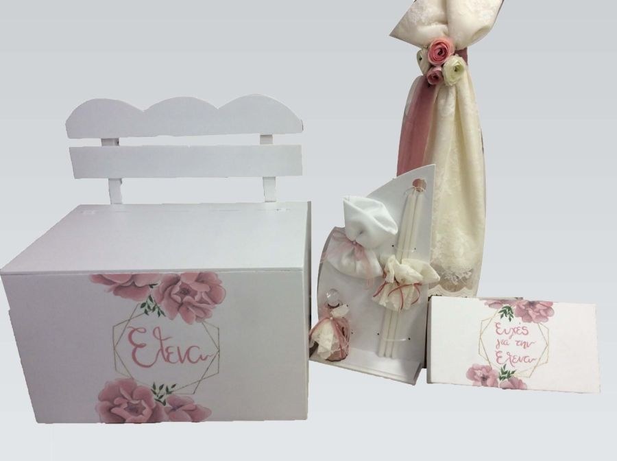 Χειροποίητο σετ βάπτισης που περιλαμβάνει παγκάκι με θέμα το τριαντάφυλλο, λαμπάδα με ξύλινο καδράκι και λαδοσέτ.