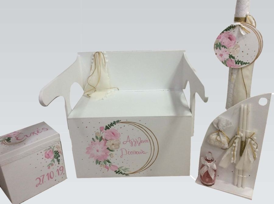 Χειροποίητο σετ βάπτισης που περιλαμβάνει θρανίο-παγκάκι ζωγραφισμένο, λαμπάδα με ξύλινο καδράκι και λαδοσέτ.