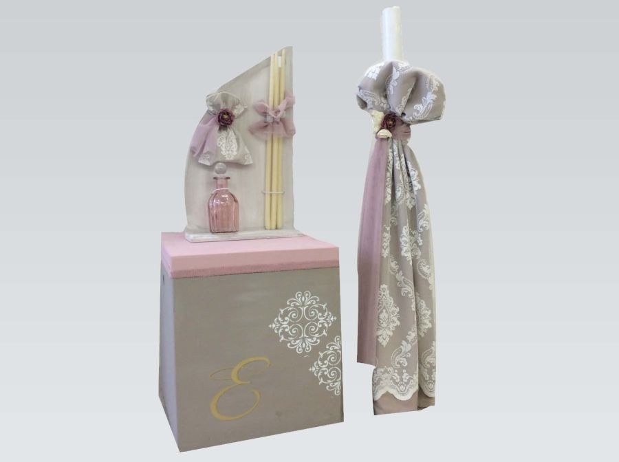 Χειροποίητο σετ βάπτισης που περιλαμβάνει κουτί με μονόγραμμα, λαμπάδα με ξύλινο καδράκι και λαδοσέτ με θέμα το αερόστατο.