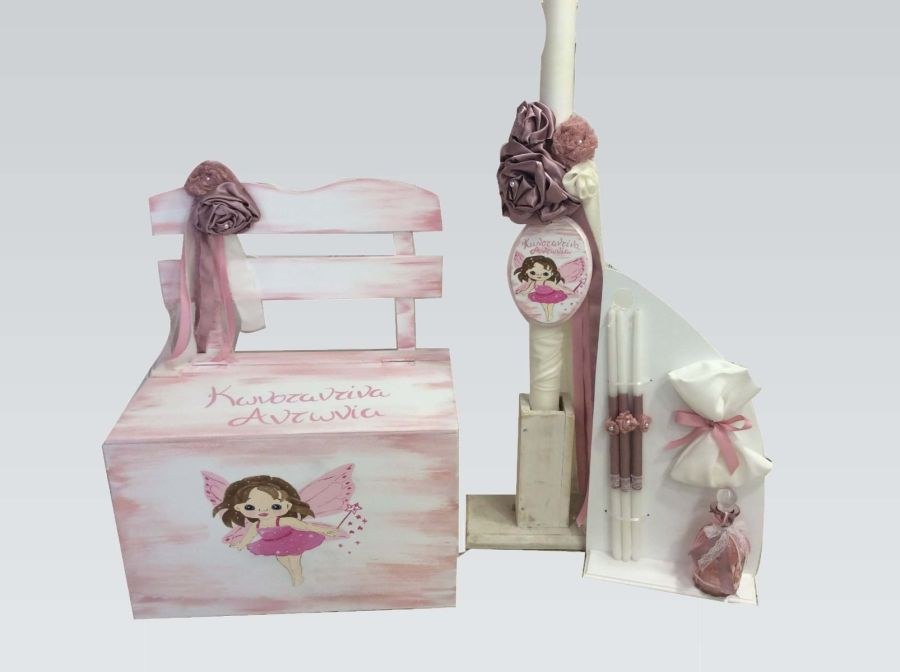 Σετ βάπτισης που περιλαμβάνει παγκάκι, λαμπάδα και λαδοσετ.