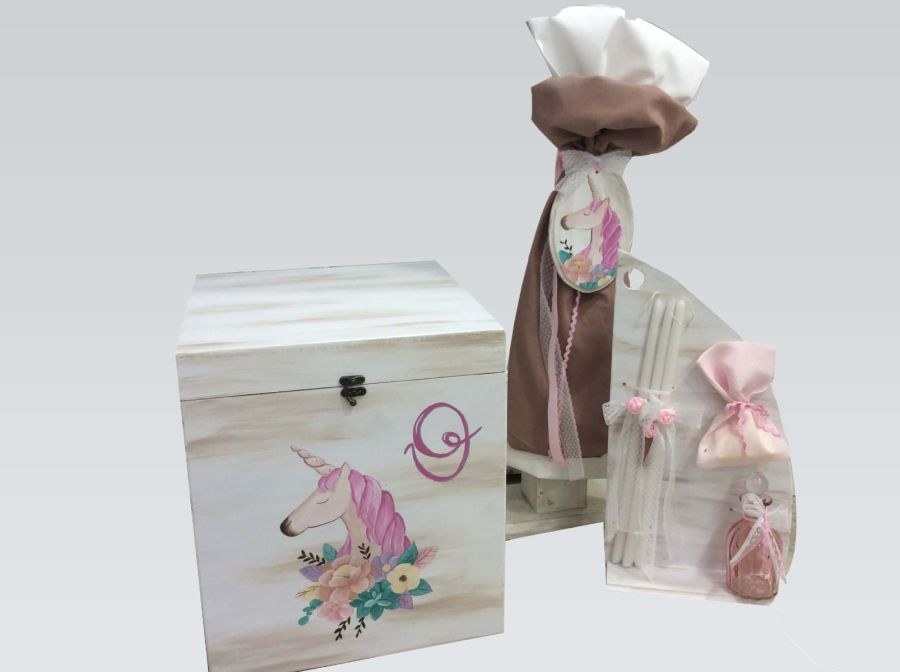Χειροποίητο σετ βάπτισης που περιλαμβάνει κουτί με θέμα μονόκερο, λαμπάδα με ξύλινο καδράκι και λαδοσέτ με θέμα το αερόστατο.