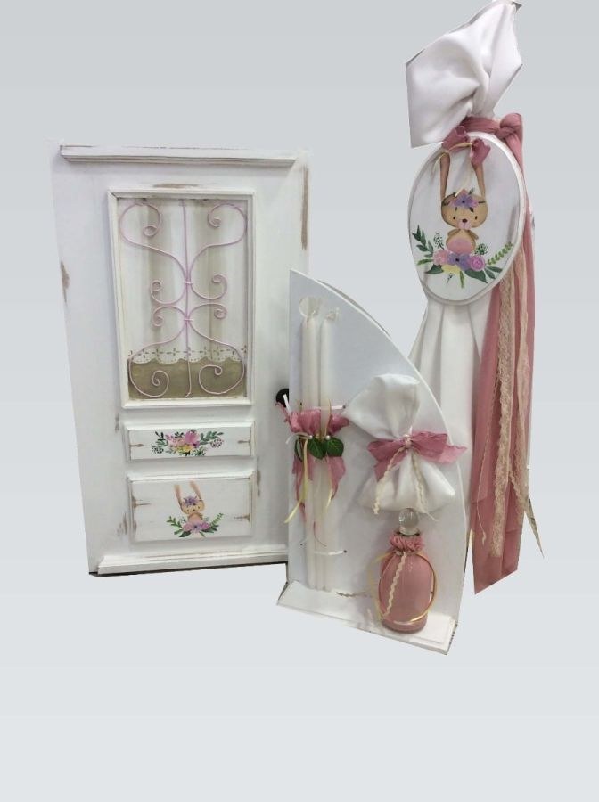 Σετ βάπτισης που περιλαμβάνει πόρτα, λαμπάδα και λαδοσετ.