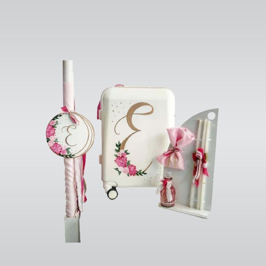 Σετ βάπτισης που περιλαμβάνει βαλίτσα, λαμπάδα και λαδοσετ.