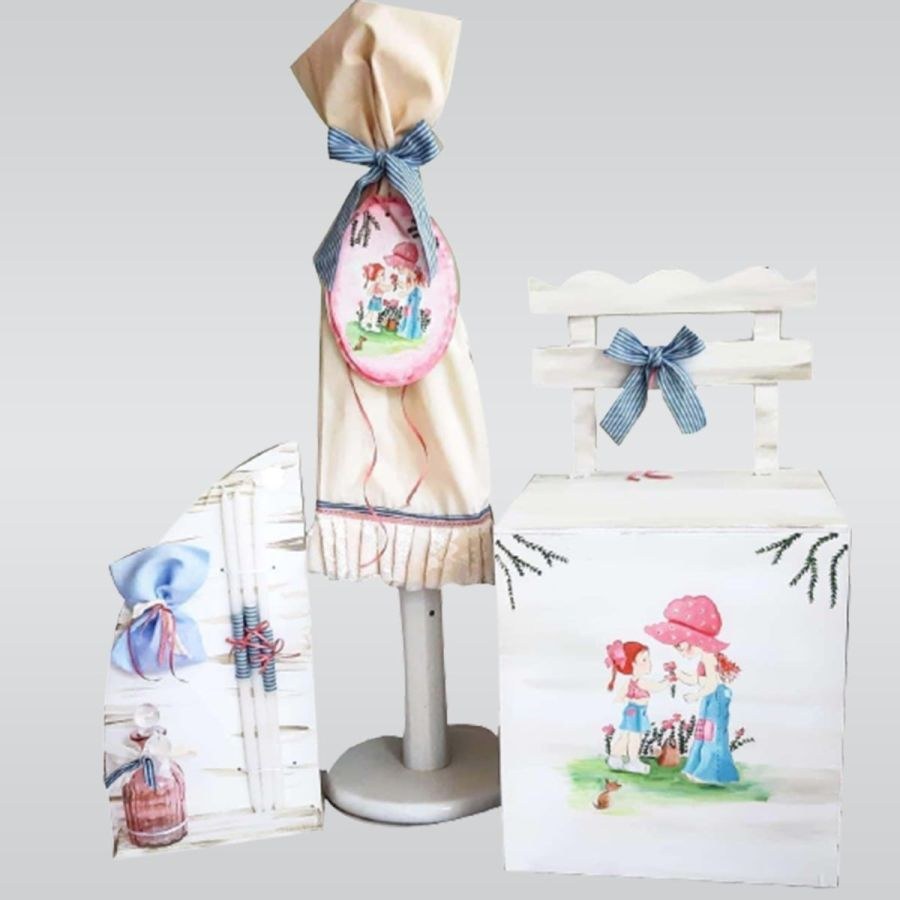 Σετ βάπτισης που περιλαμβάνει ζωγραφιστό παγκάκι, λαμπάδα και λαδοσετ.