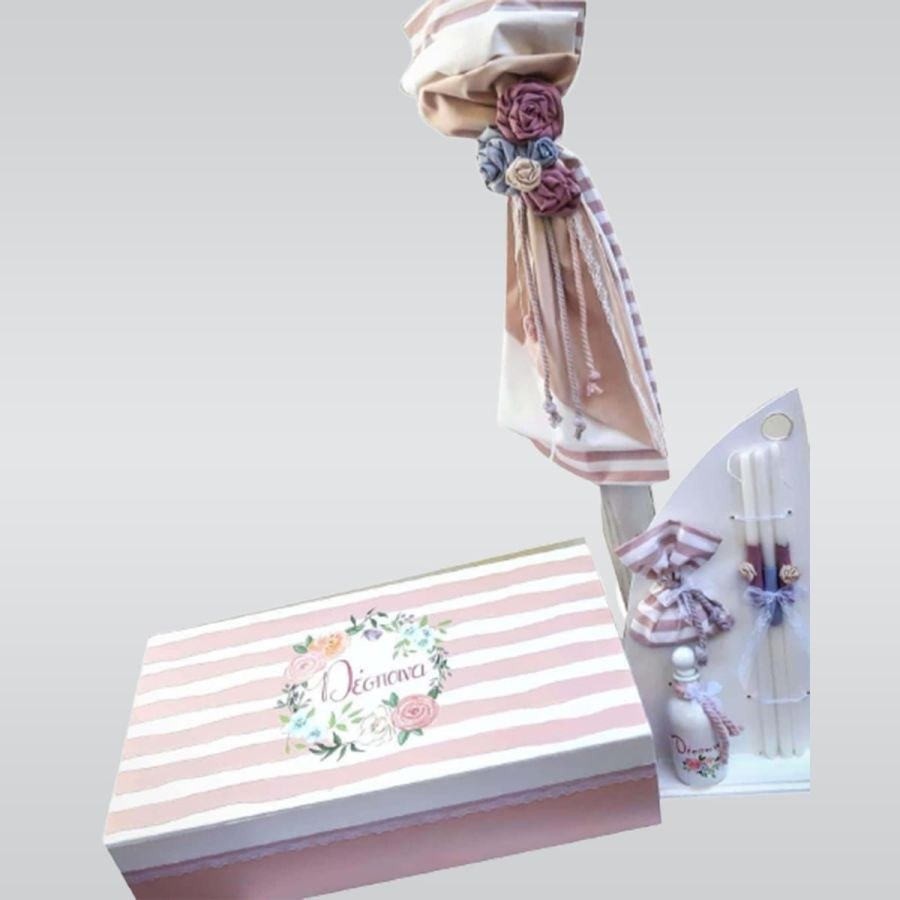 Σετ βάπτισης που περιλαμβάνει μπαούλο, λαμπάδα και λαδοσετ.