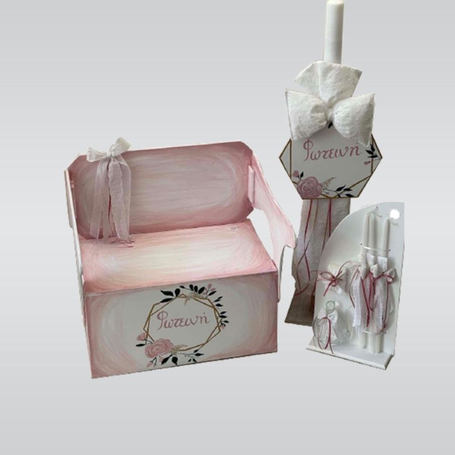 Σετ βάπτισης που περιλαμβάνει θρανίο-παγκάκι, λαμπάδα και λαδοσέτ.