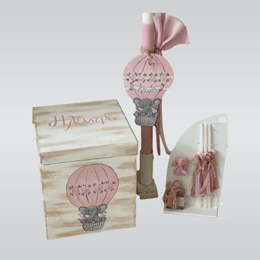 Σετ βάπτισης που περιλαμβάνει κύβο με ζωγραφισμένο ελεφαντάκι και αερόστατο, λαμπάδα και λαδοσετ.