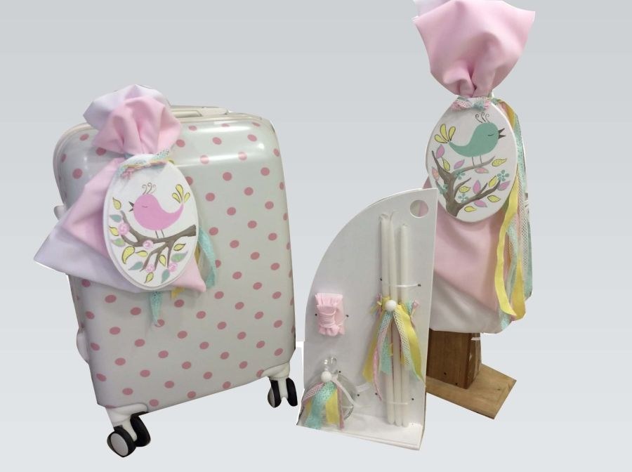 Σετ βάπτισης που περιλαμβάνει βαλίτσα στολισμένη, λαμπάδα και λαδοσετ.