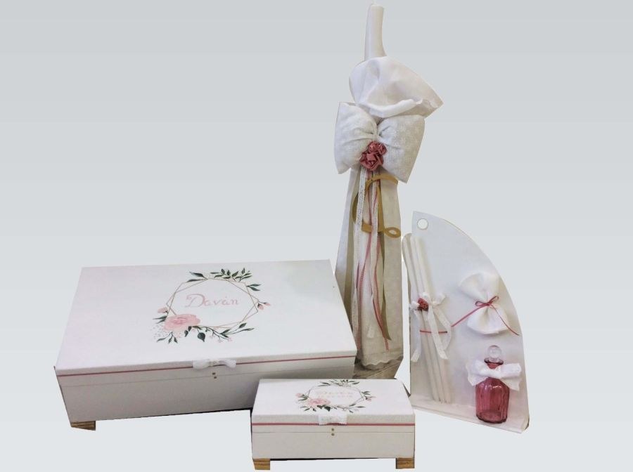 Σετ βάπτισης που περιλαμβάνει βαλίτσα ξύλινη, λαμπάδα και λαδοσετ.