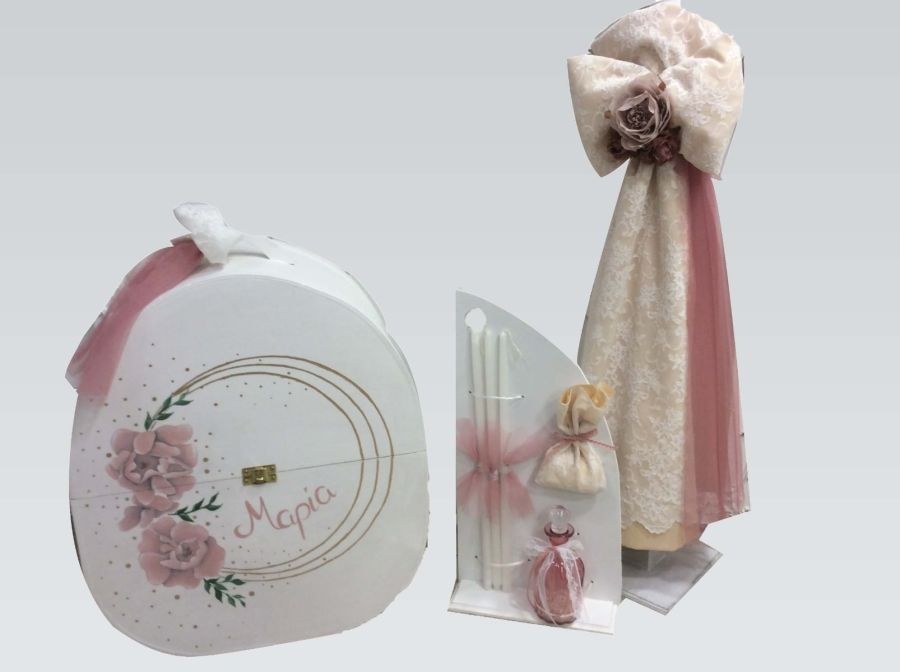 Σετ βάπτισης που περιλαμβάνει ξύλινη βαλίτσα, λαμπάδα και λαδοσετ.