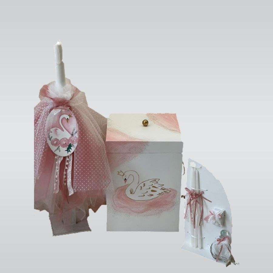 Σετ βάπτισης που περιλαμβάνει κύβο με θέμα τον κύκνο, λαμπάδα και λαδοσετ.