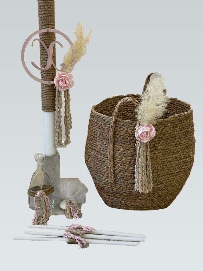 Σετ βάπτισης που περιλαμβάνει καλάθι, λαμπάδα και λαδοσετ.