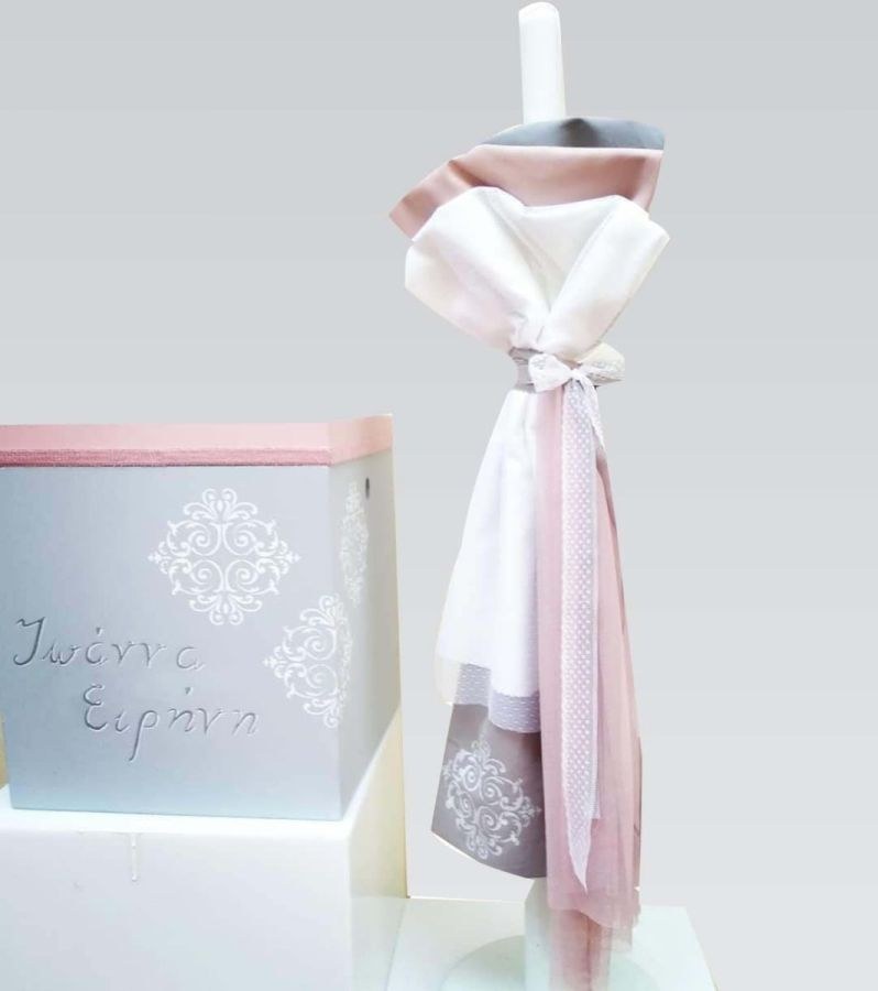 Χειροποίητο σετ βάπτισης που περιλαμβάνει κουτί ζωγραφισμένο με σχέδιο και όνομα, λαμπάδα με ξύλινο καδράκι και λαδοσέτ.