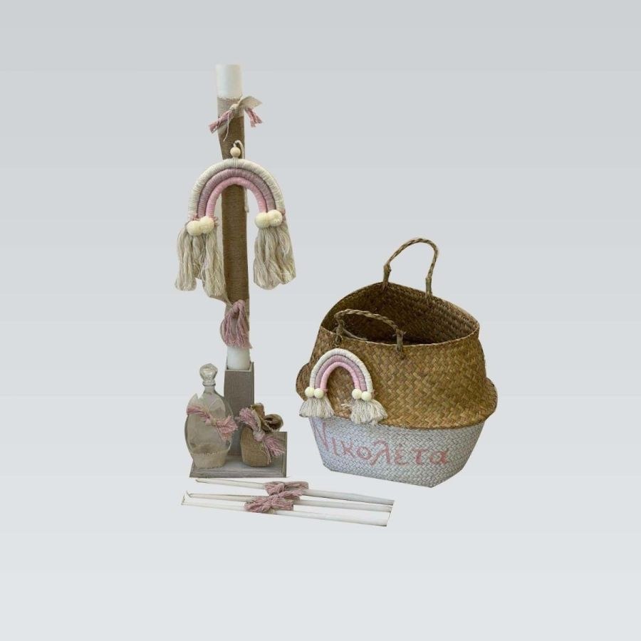 Σετ βάπτισης που περιλαμβάνει ψάθινο καλάθι με μάτι, λαμπάδα και λαδοσετ.