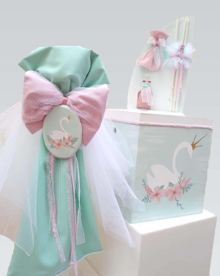 Χειροποίητο σετ βάπτισης που περιλαμβάνει κουτί ζωγραφισμένο με λουλούδια και βασιλικό κύκνο, λαμπάδα με ξύλινο καδράκι και λαδοσέτ.